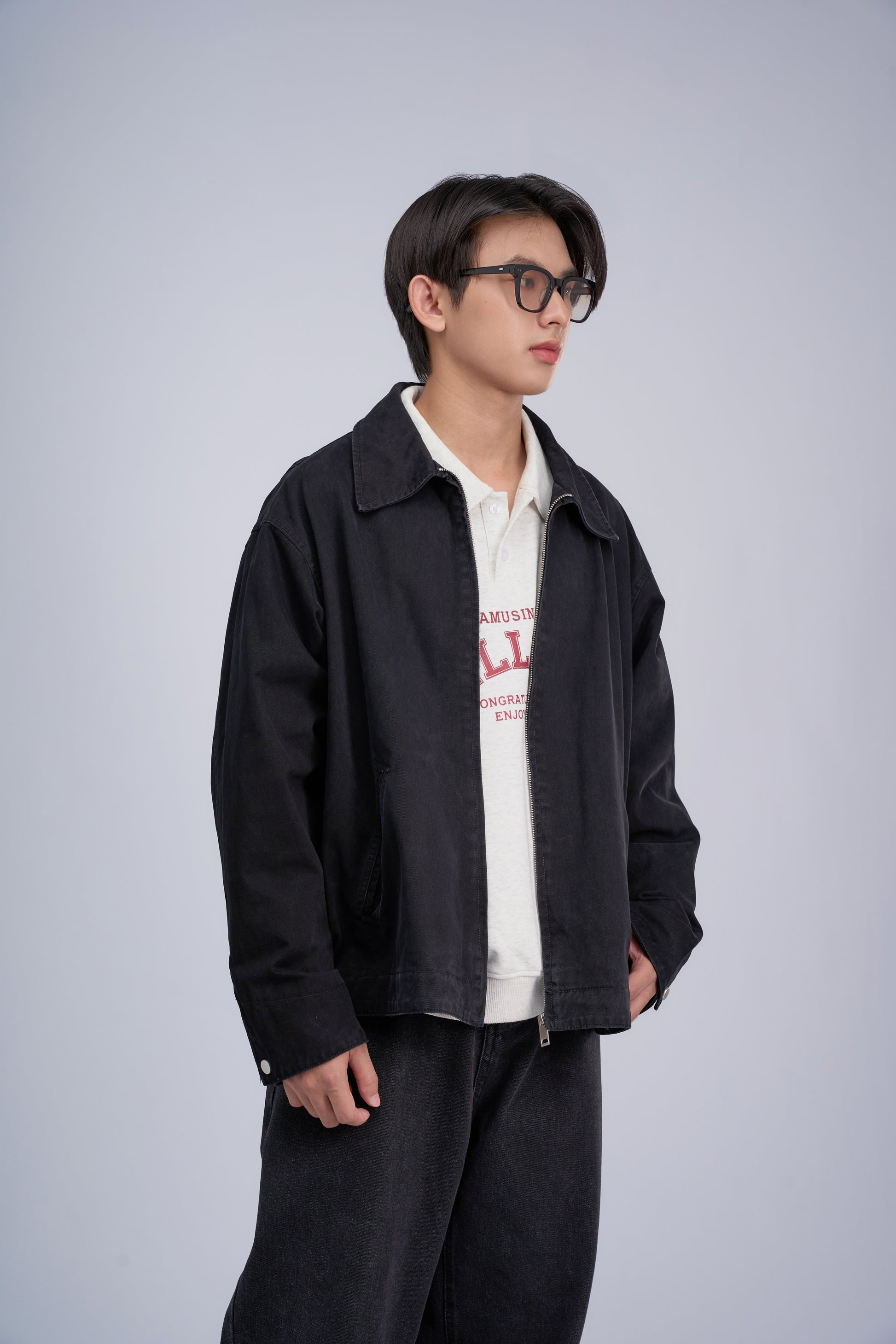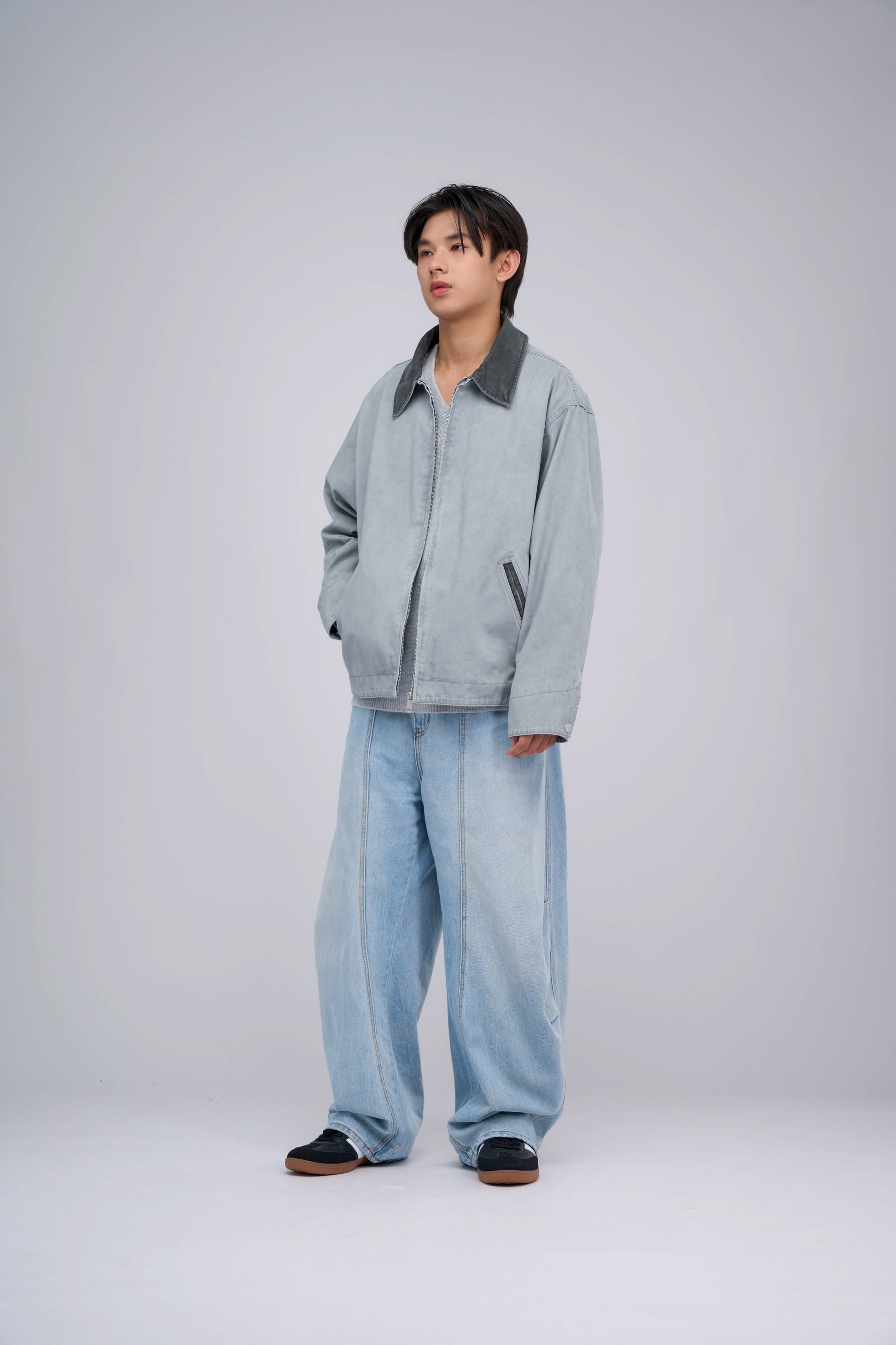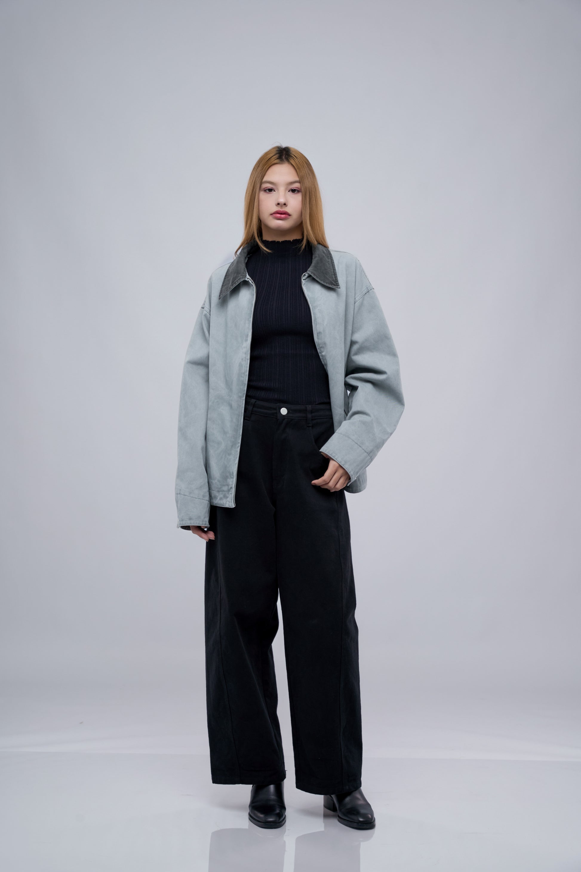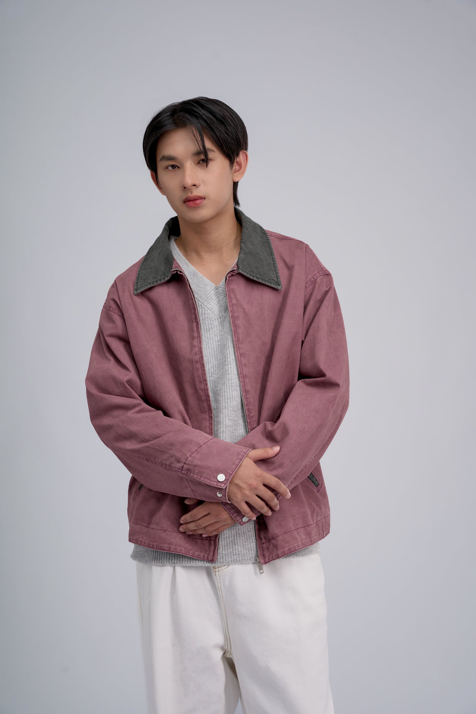 Featuring a contrast shirt-style collar, long sleeves with snap-button cuffs, and two front pockets that offer both functionality and a stylish finish. A full front zipper allows for easy on and off, making it a perfect choice for casual days or workwear when comfort and versatility are key.