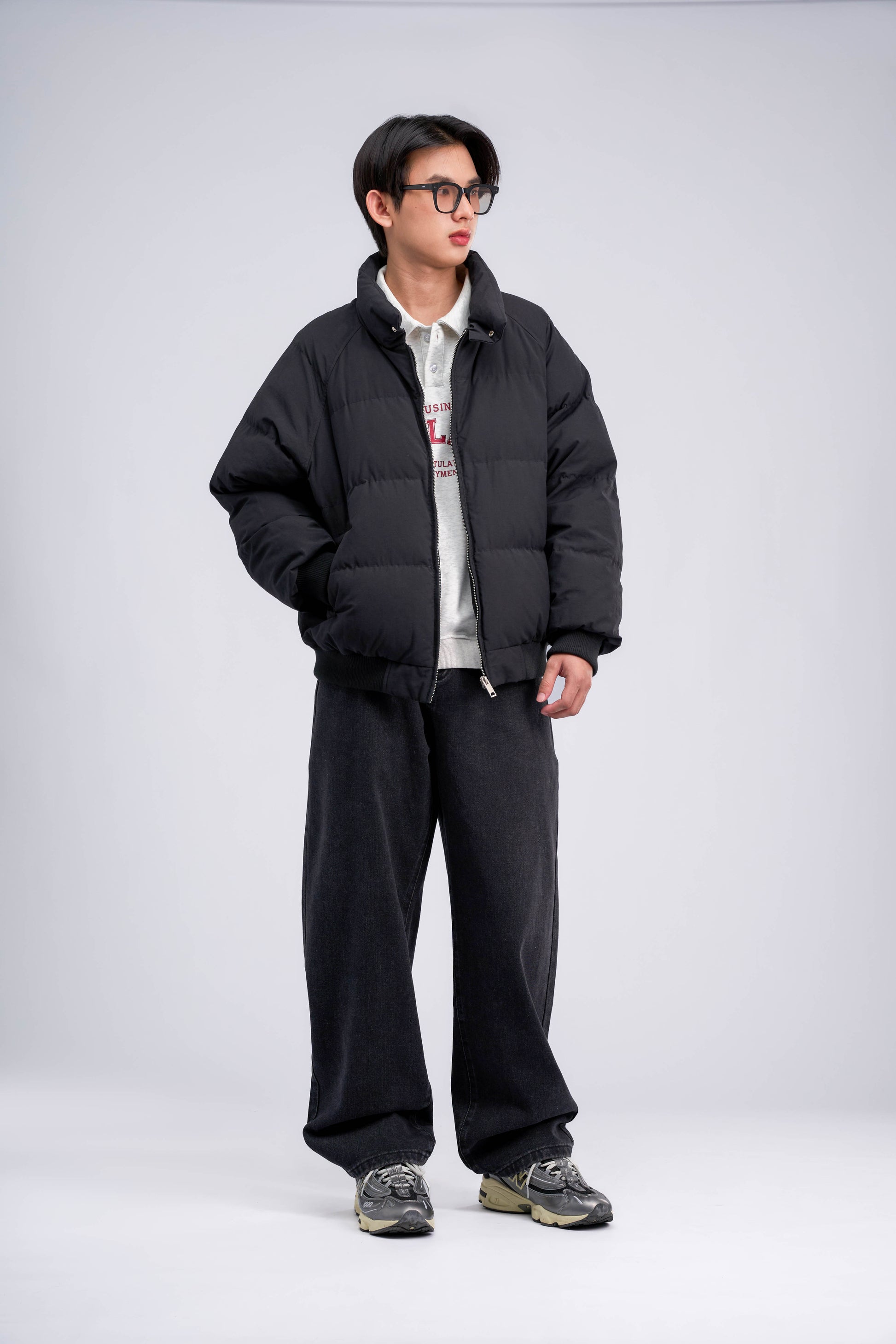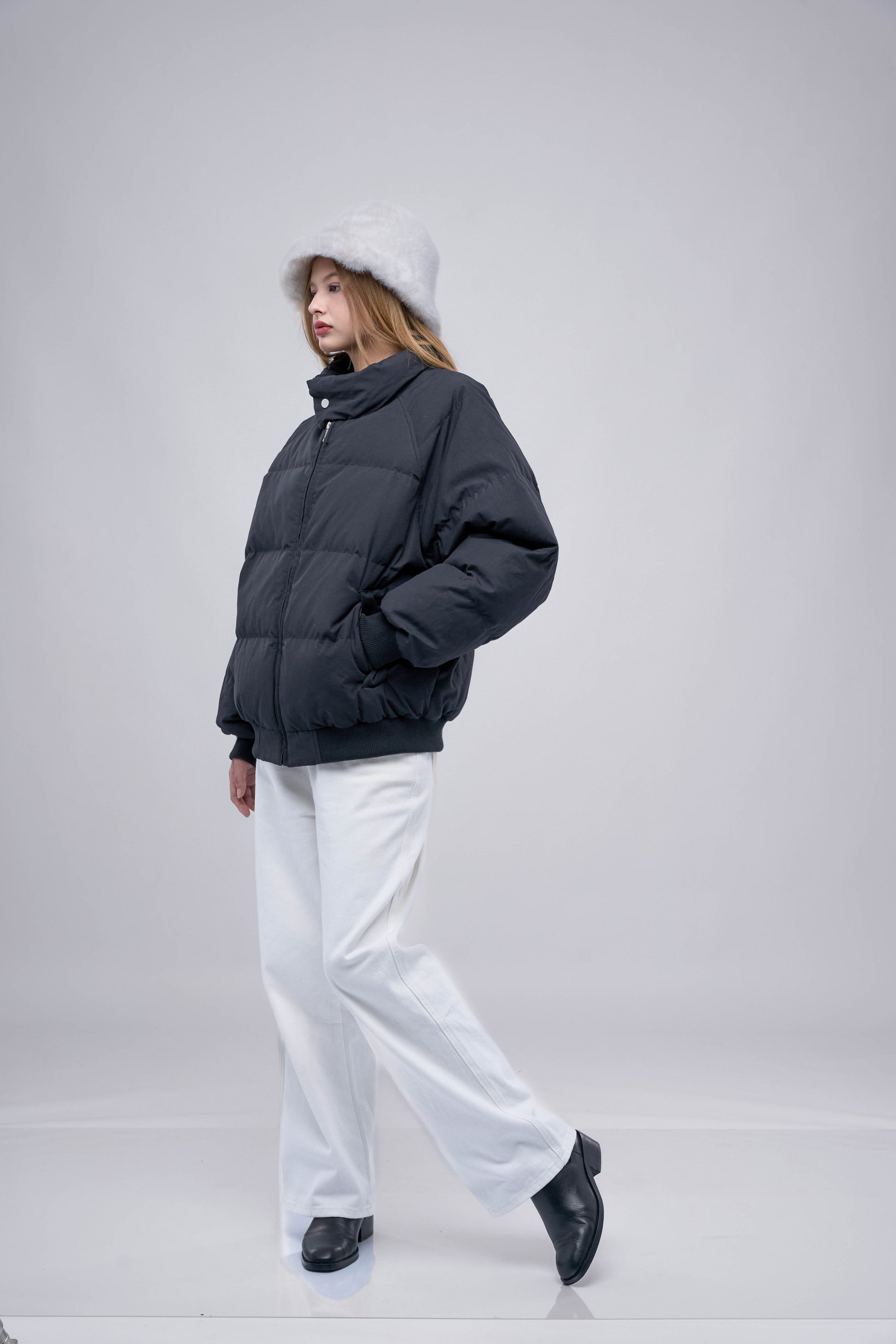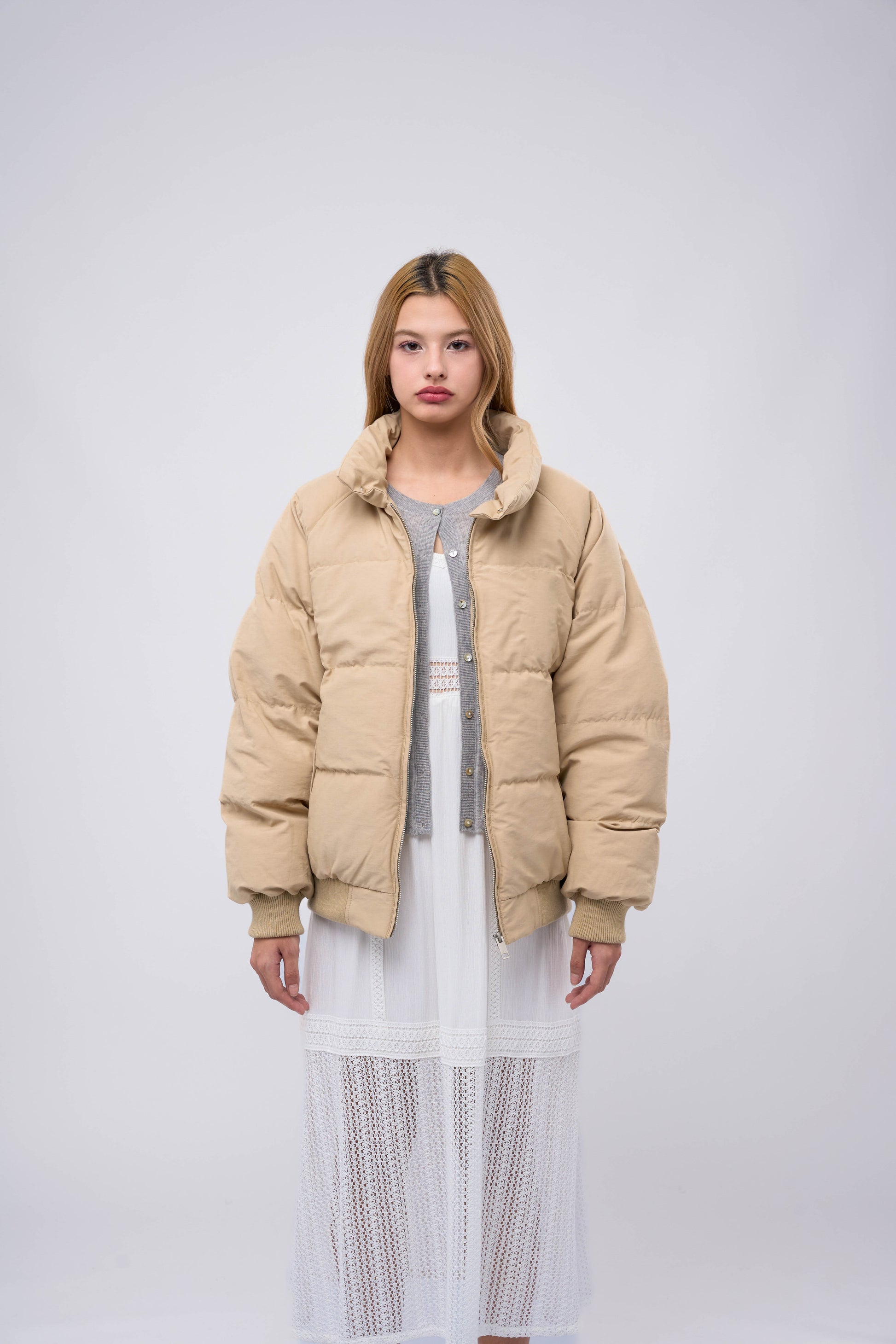 Puffer jacket made from 65% nylon and 35% cotton, featuring durable fabric that blocks wind and provides warmth. Designed with horizontal quilting and lightweight lining. High collar protects against the cold. Long puffed sleeves and a smooth front zipper closure offer comfort. Suitable for everyday wear and travel in cold weather.