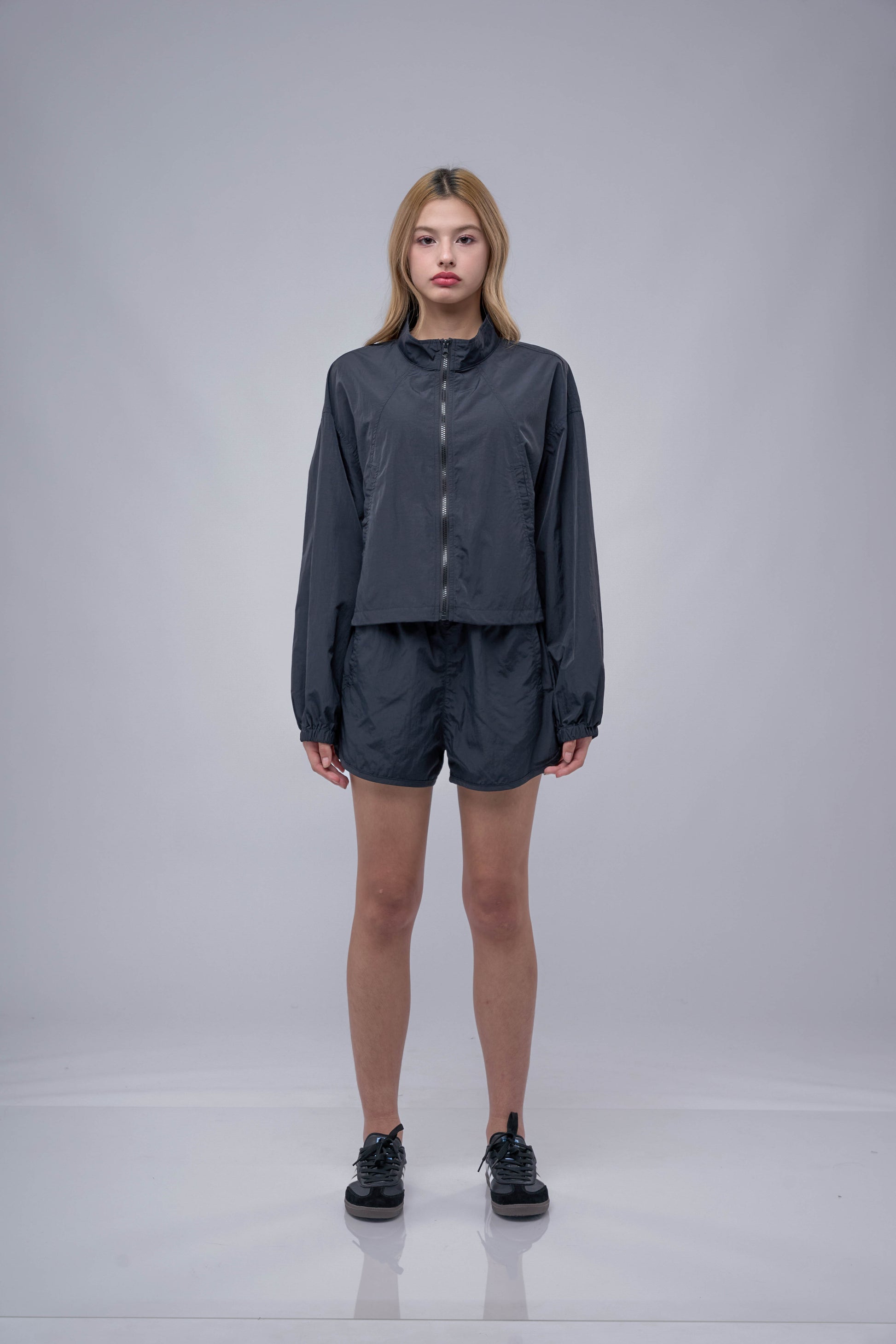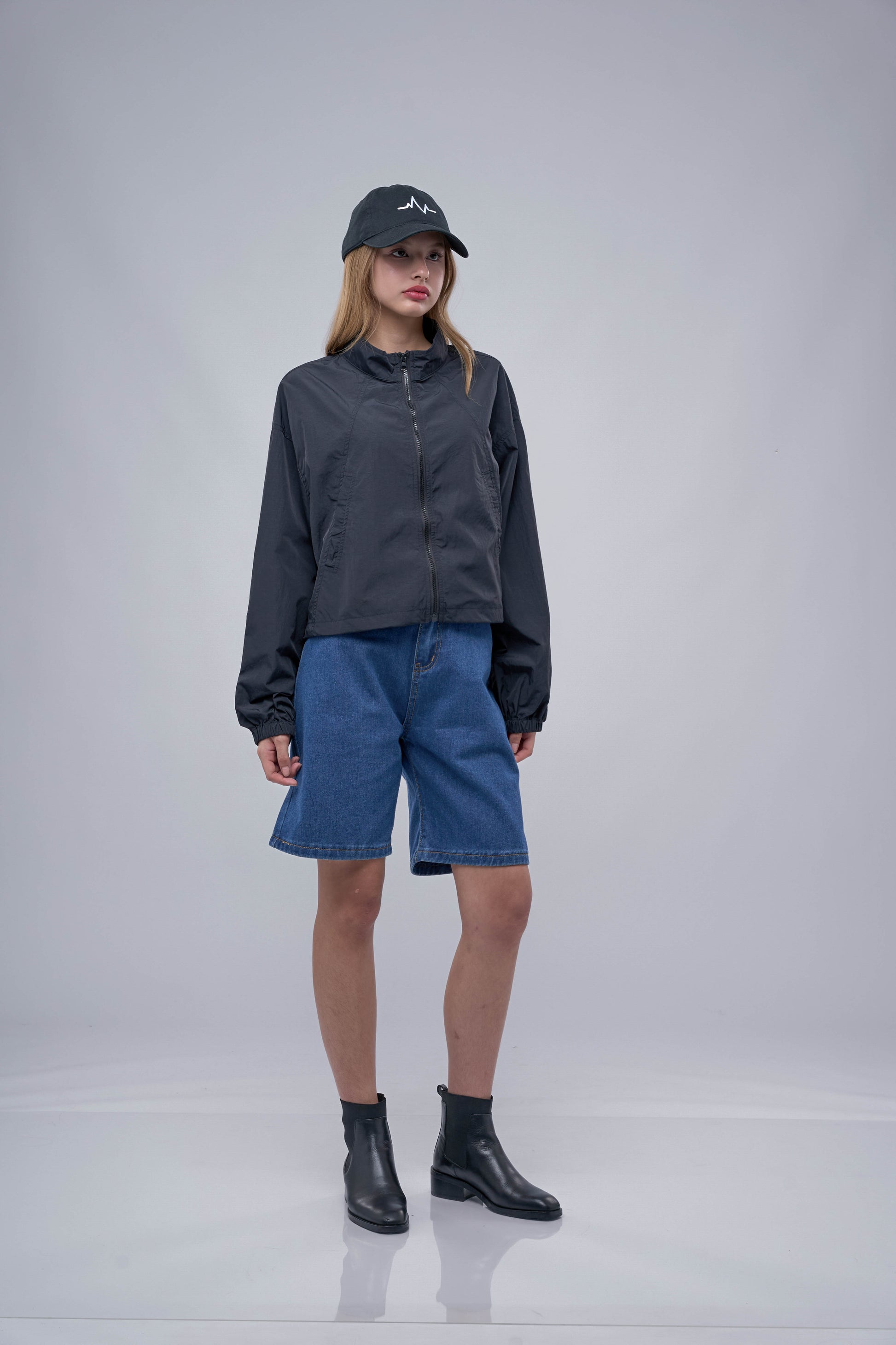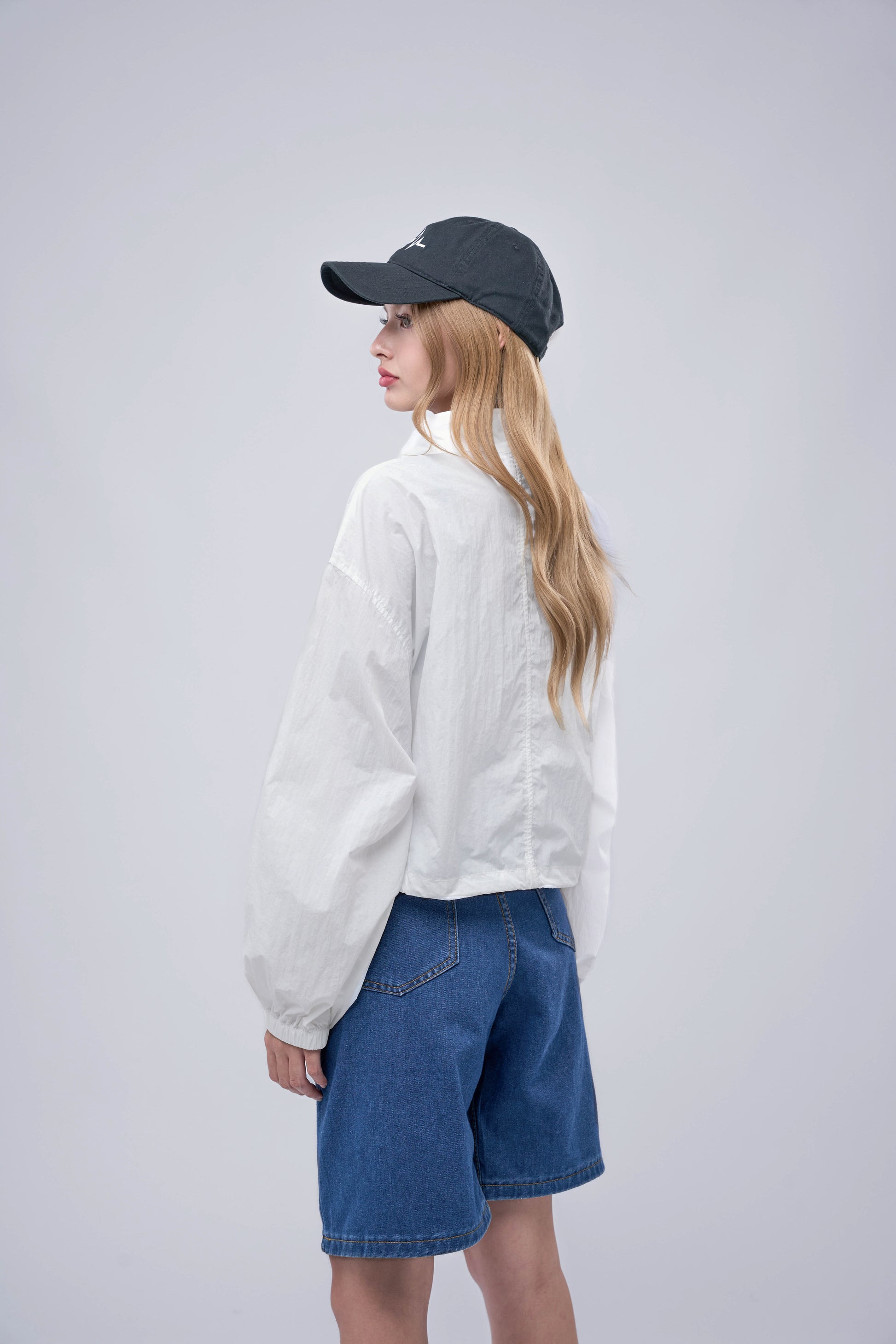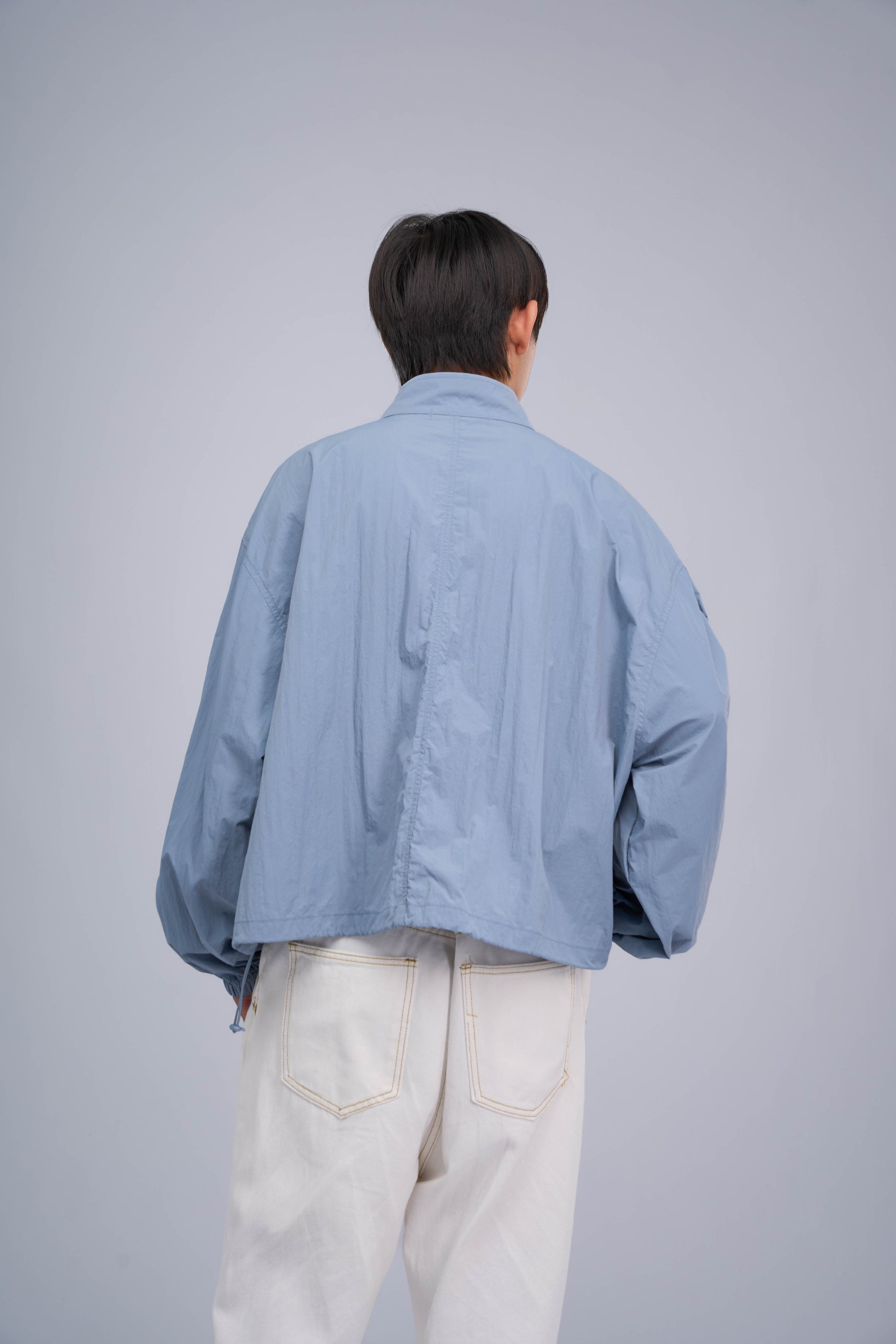 Nylon jacket with a soft, lightweight fabric that is breathable and ideal for outdoor activities. Features a stand-up collar, loose-fitting long sleeves for easy movement, and elastic cuffs for a snug fit that blocks wind effectively. Front zipper closure with two side pockets. Provides sun protection with SPF50+. Waist-length design for added mobility and a modern look.